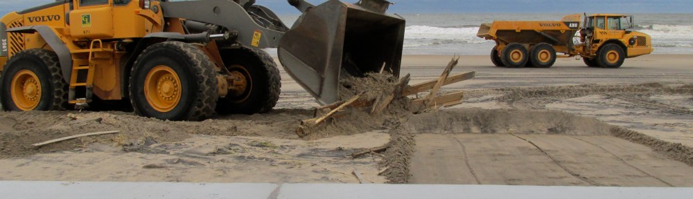 The concrete sea wall, with beach sand piled to the top of the wall. Normally, the top of the sea wall is four feet or more above the beach. The sea wall protects the boardwalk from being destroyed by waves from hurricanes and nor’easters. Also protected, millions of dollars worth of real estate in the resort town. Just another project made possible by the Army Corps of Engineers. Cloudy sky made possible by Hurricane Sandy. (See that huge wood beam? How did that get here? Storm debris like this, driven by powerful waves, is the kind of thing that destroys buildings.)