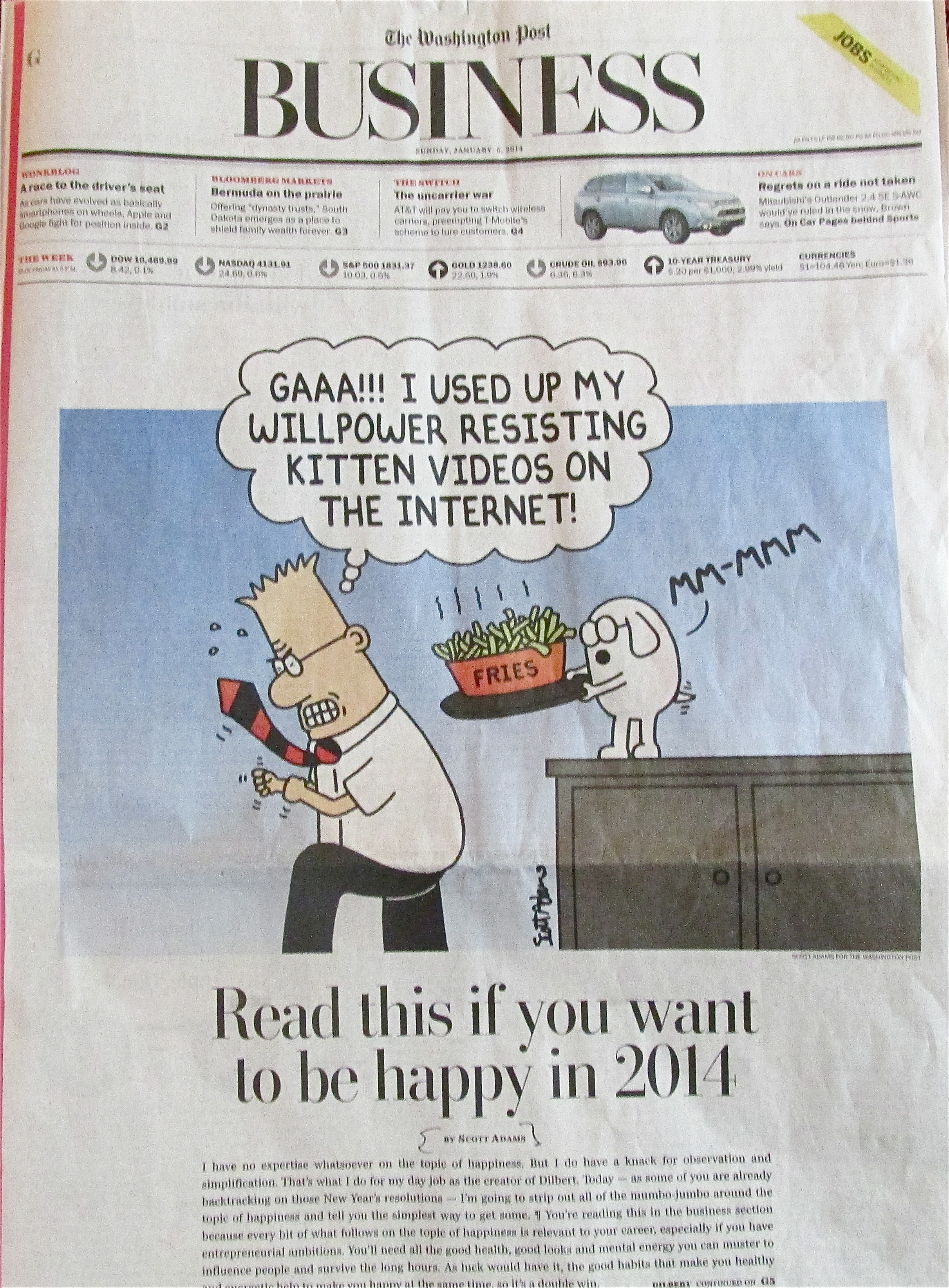 The mystery is, why is the “happiness” story on the front of the Sunday Business section? Why is the top half of the Business page devoted entirely to a cartoon, including a dog holding a plate of French fries?